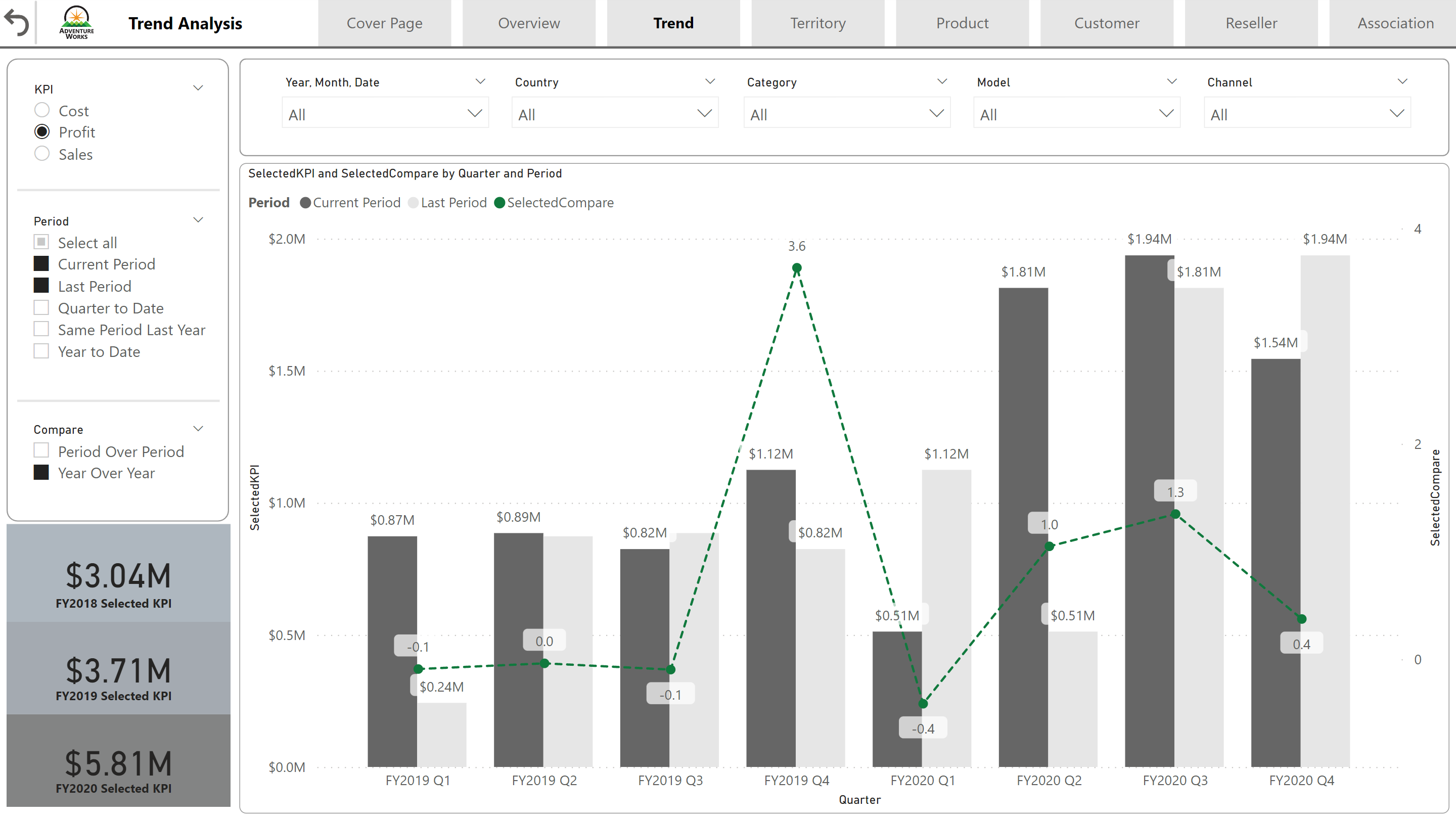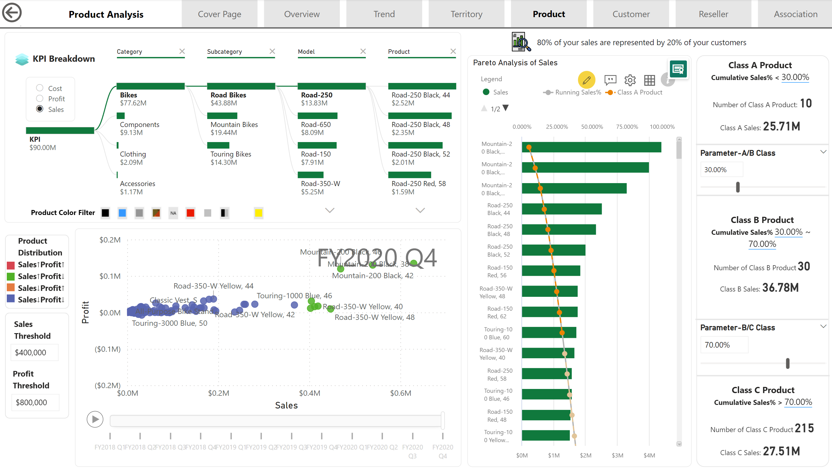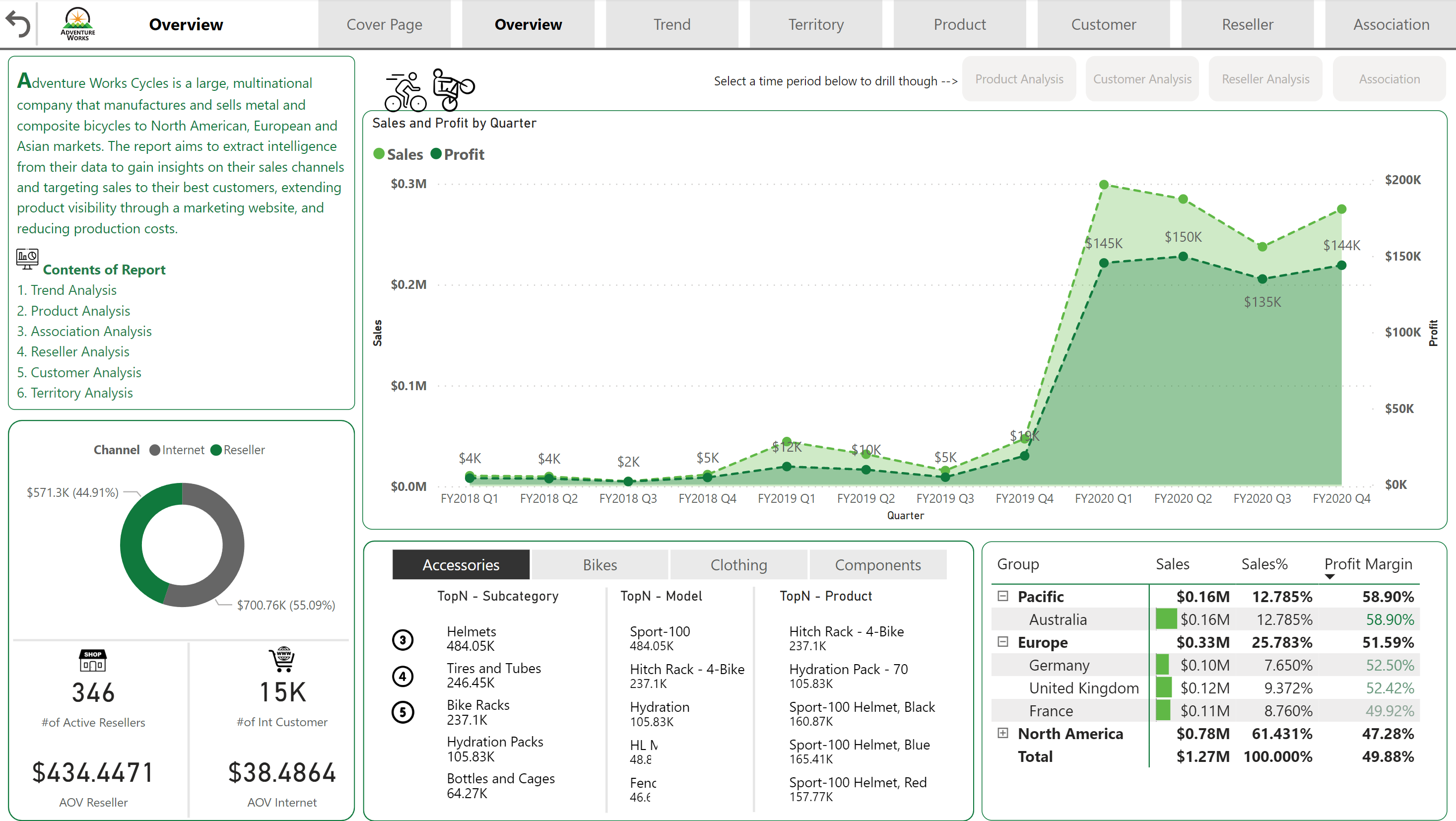 - The Adventure Works dataset analysis revealed that the most popular product categories are accessories, bikes, and clothing, generating a total of $23.6 million in revenue.